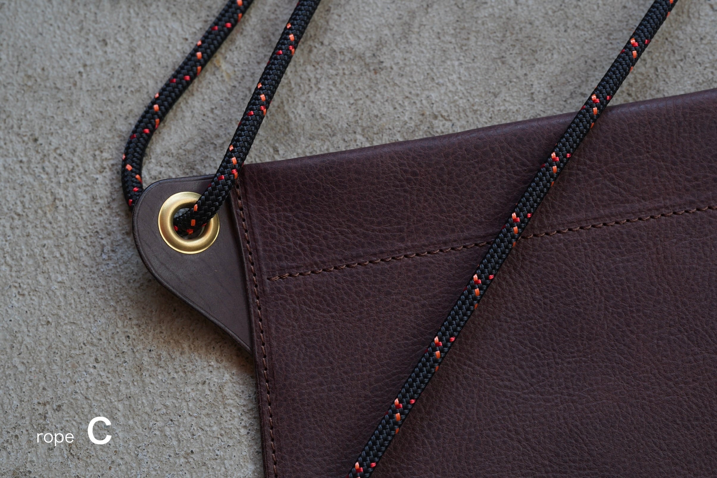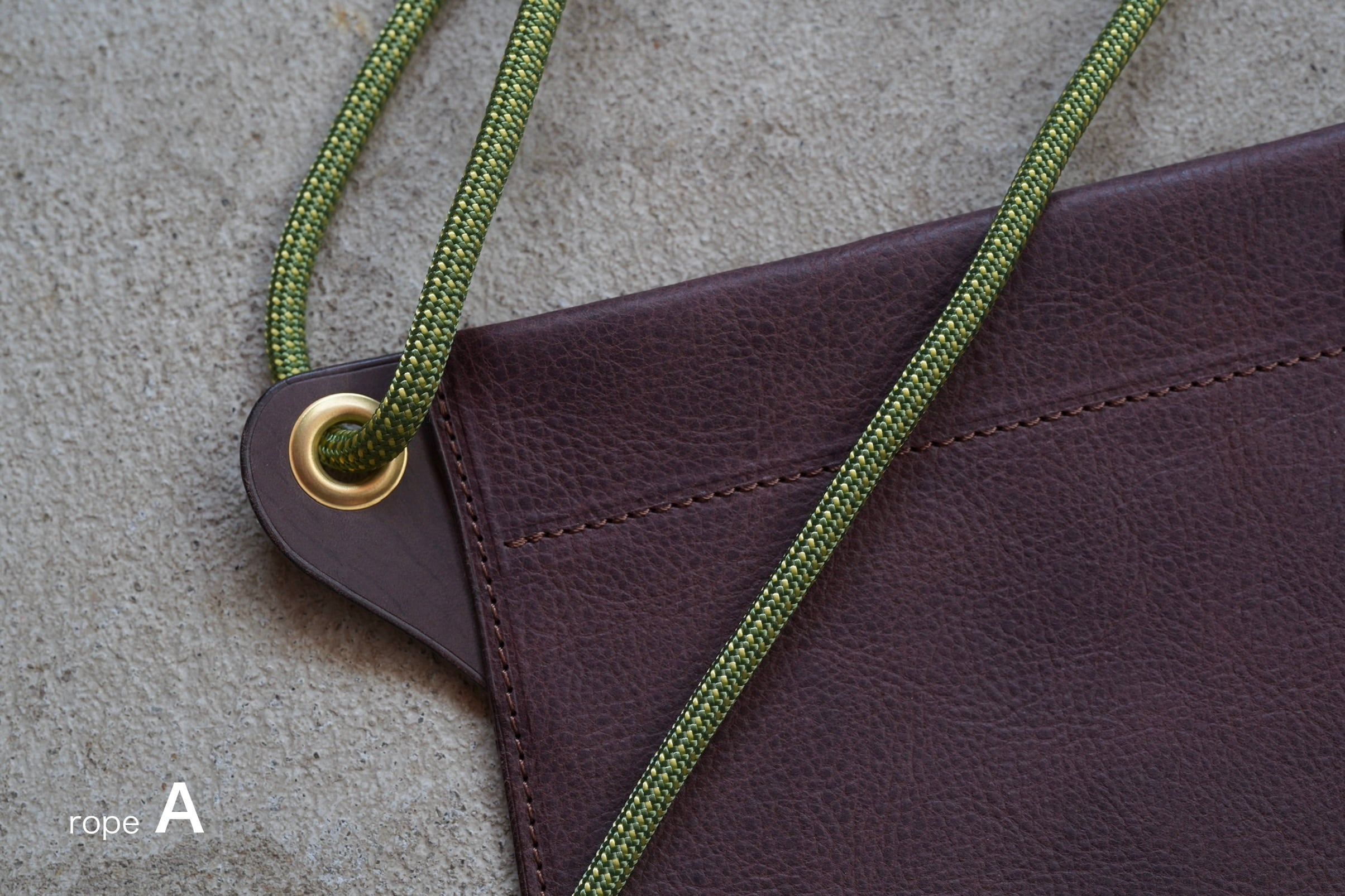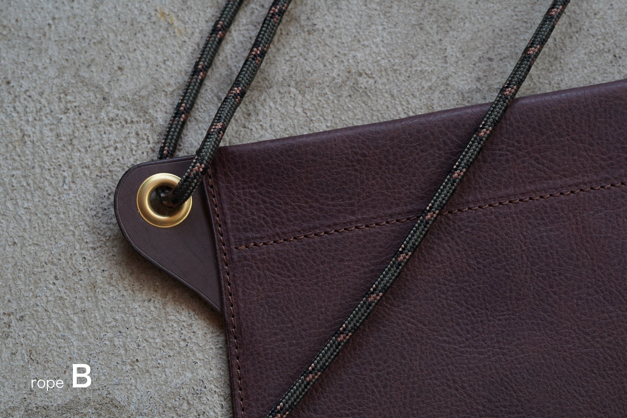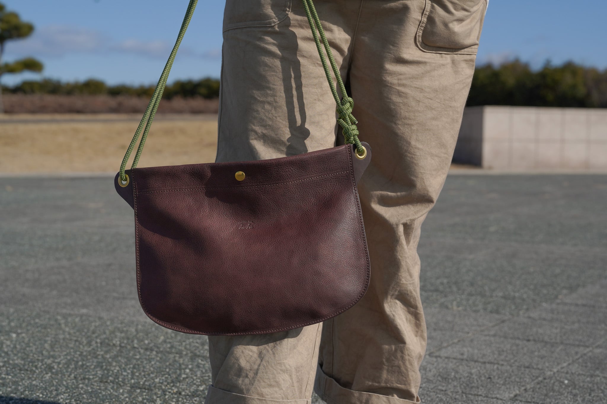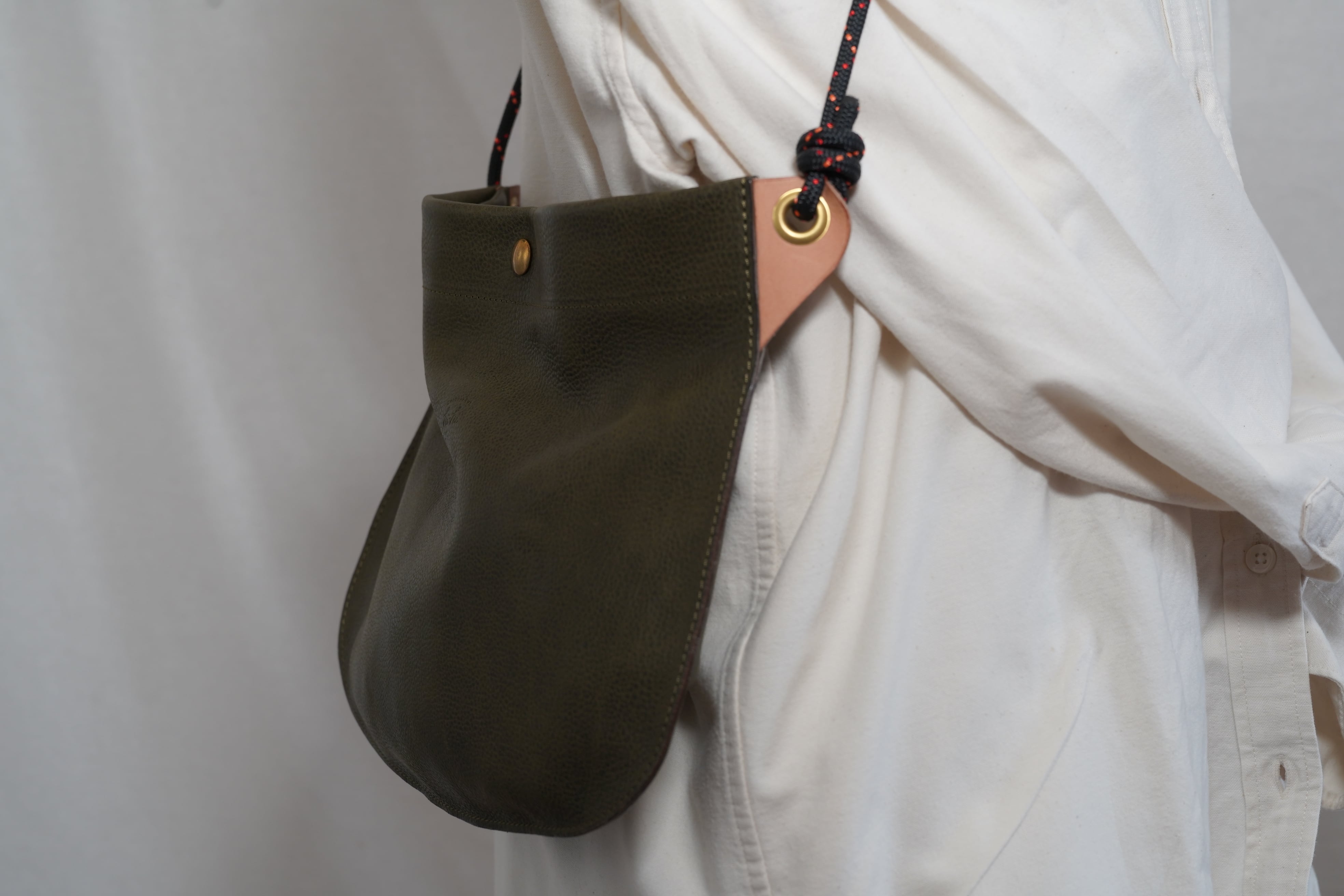 このサコッシュは、革とアウトドアロープを組み合わせたものです。