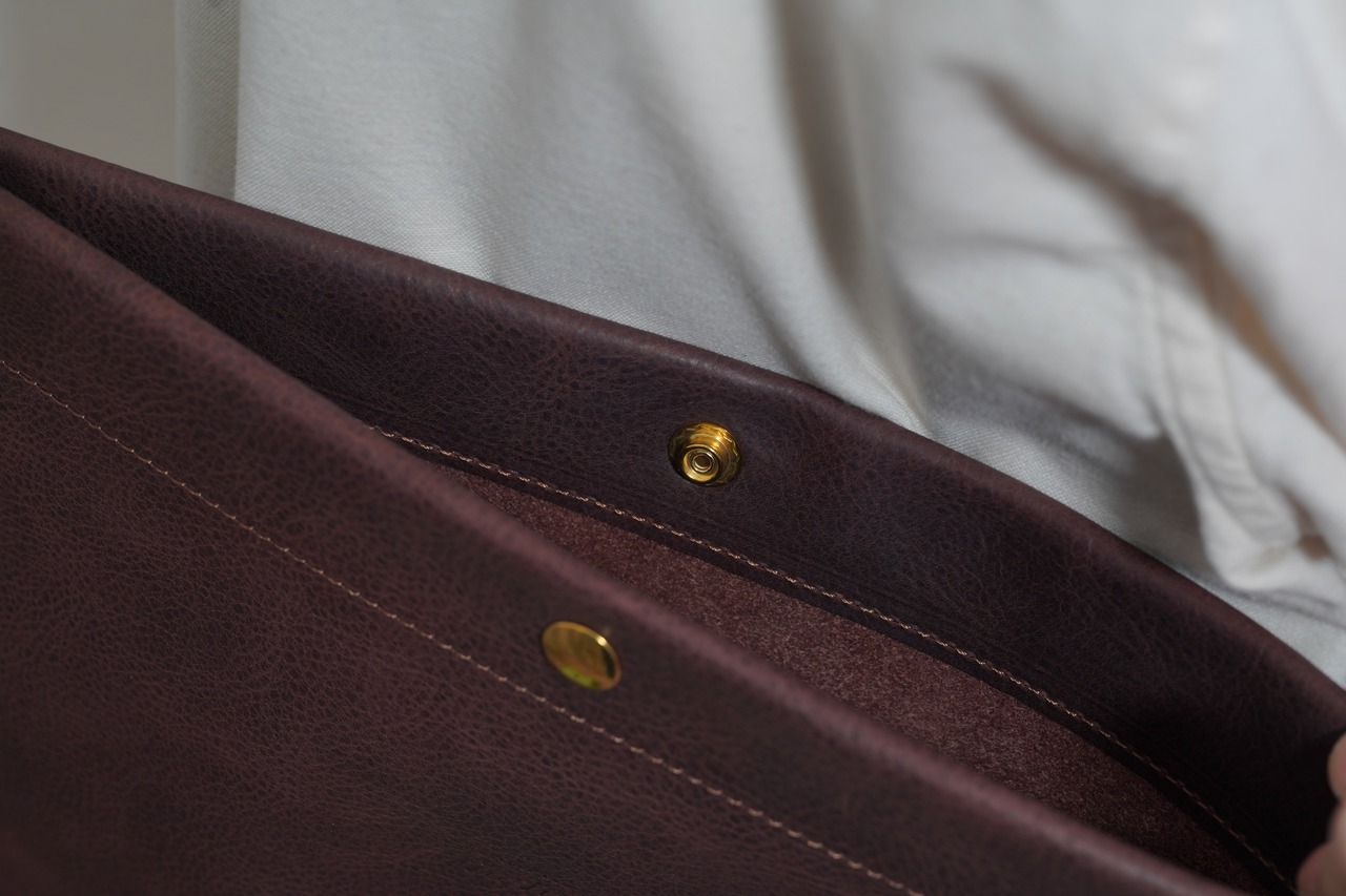 フラットな佇まいに、持ち物を入れ身につけるとふっくらと膨らみ、それが馴染んでいき、連れ歩くごとに革の表情が深まっていきます。