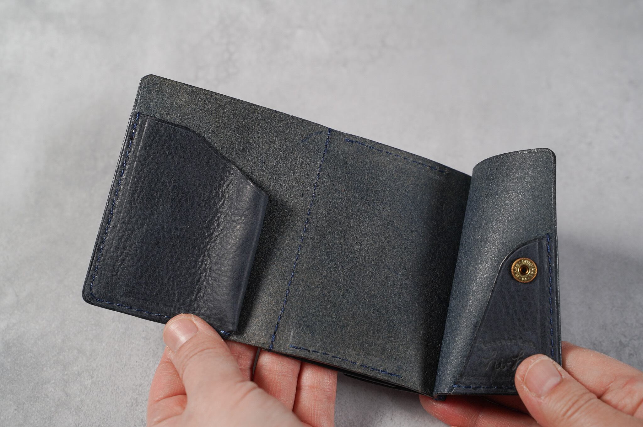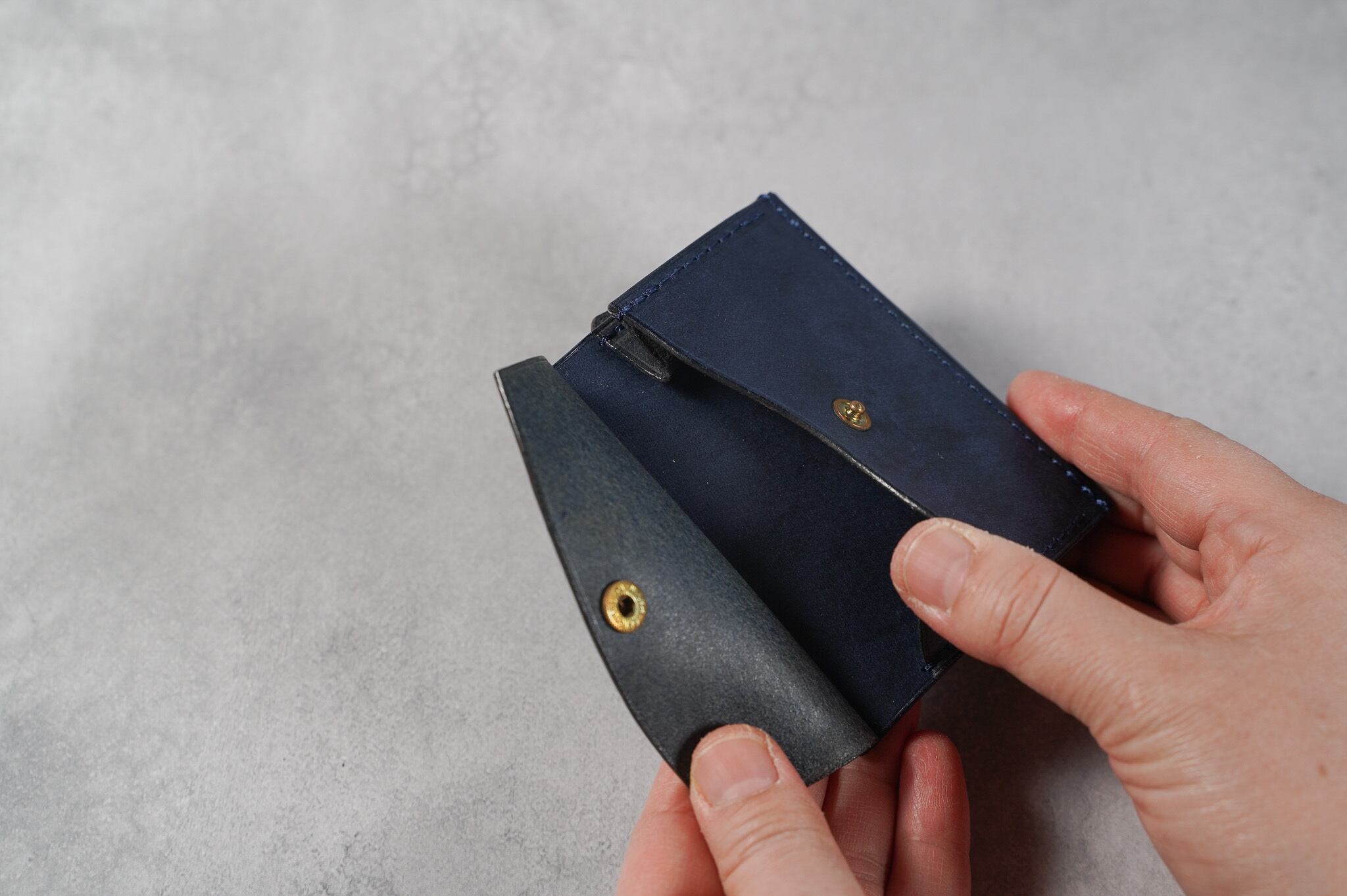 お札は約10枚、カードはプラスチック製の厚さのものを約5枚収納でき、小銭入れは浅めで見やすく、財布を畳んだ時は外側にあるので、見た目以上の容量です。