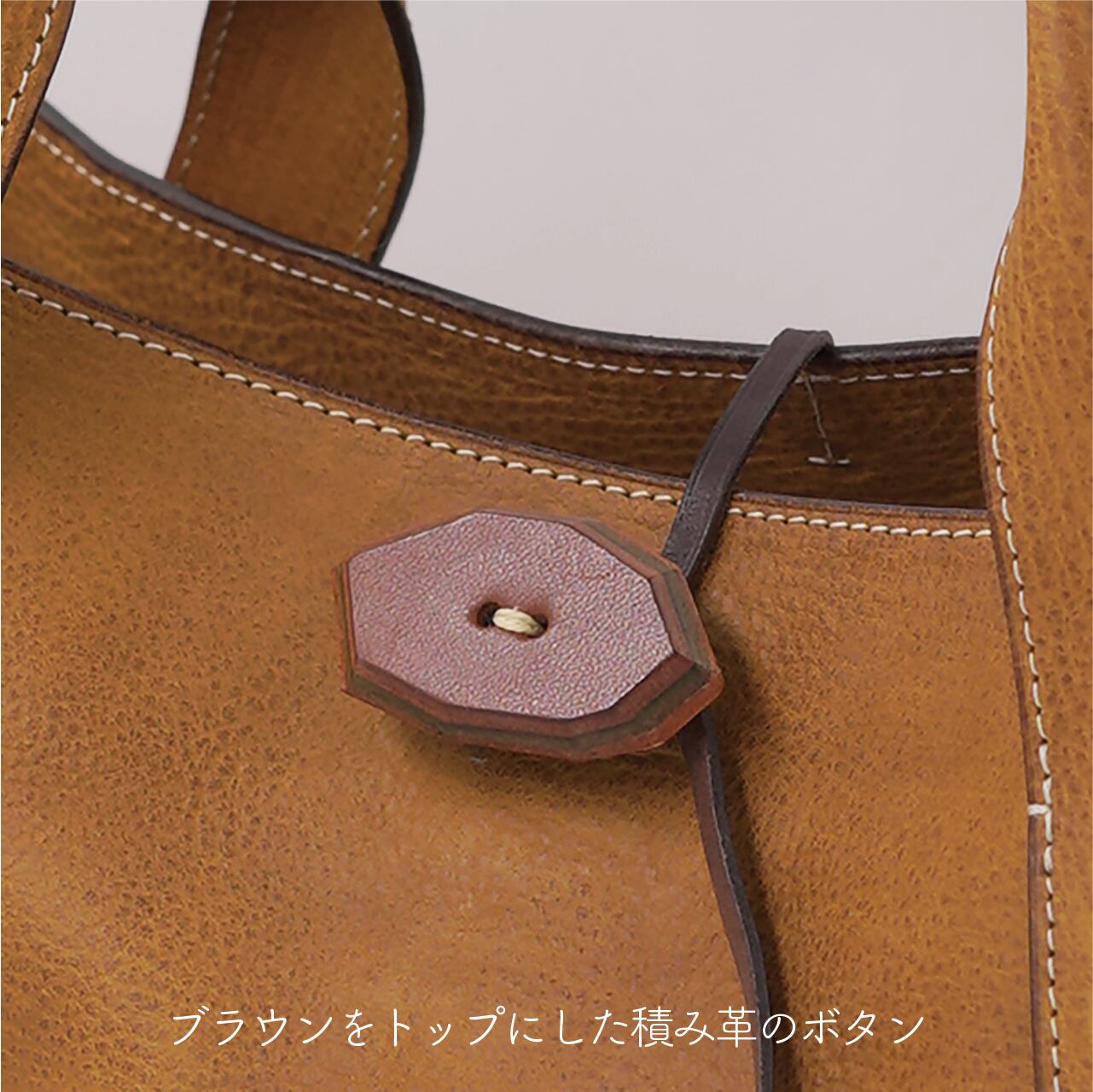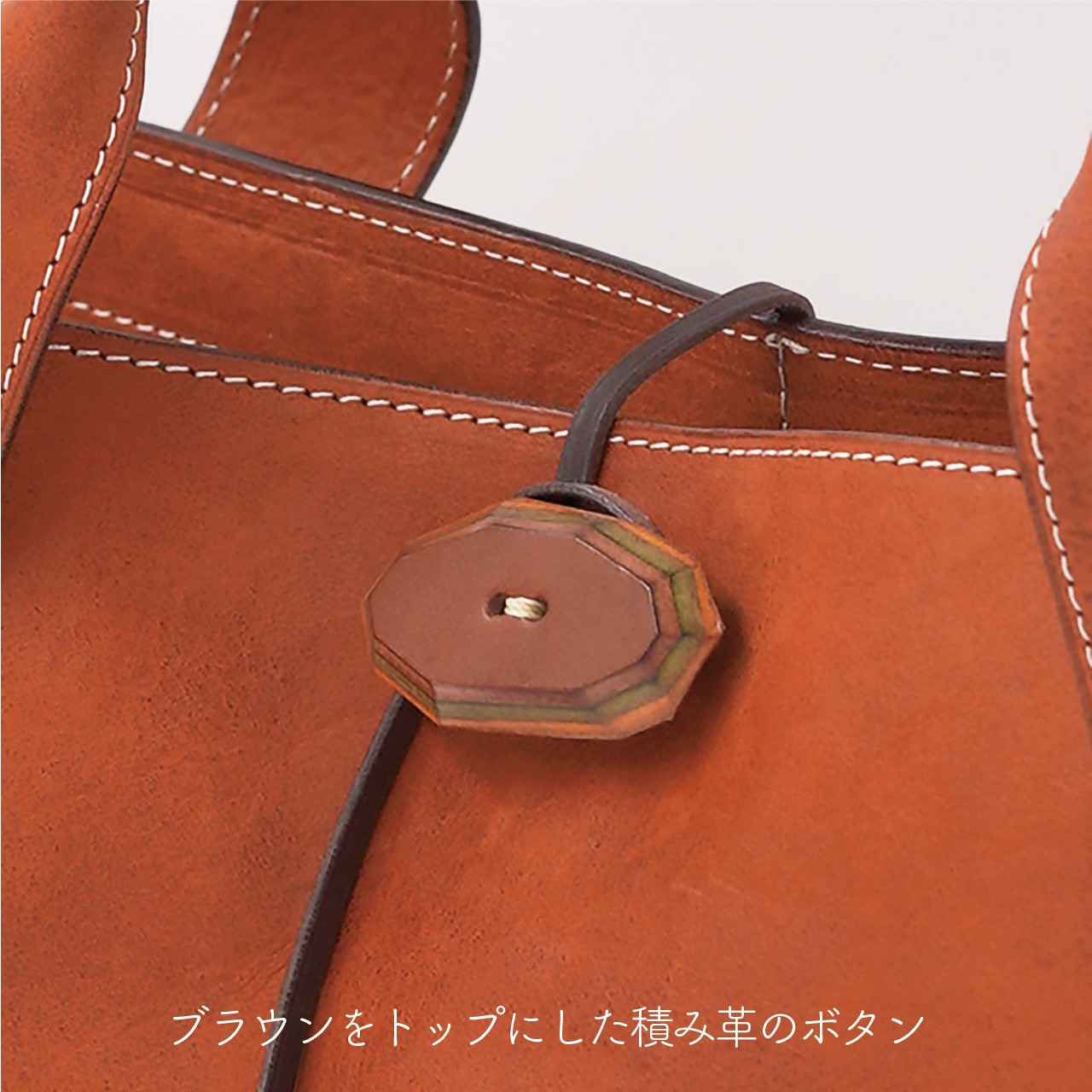 革で作られた、革紐をくくるボタンは、全体に馴染ませる同色系か、