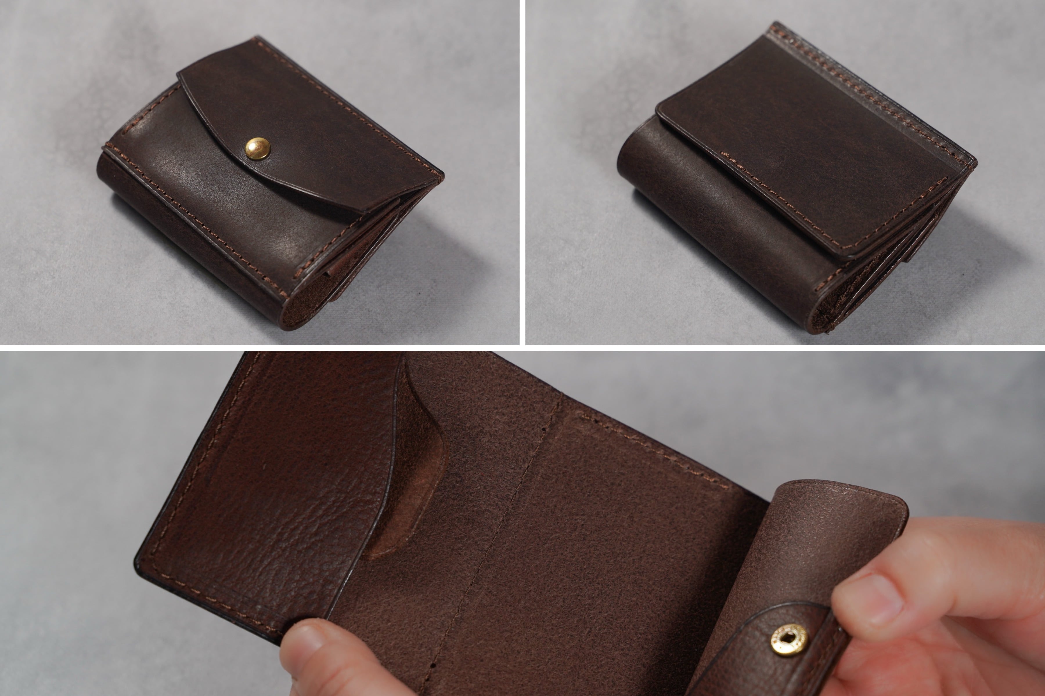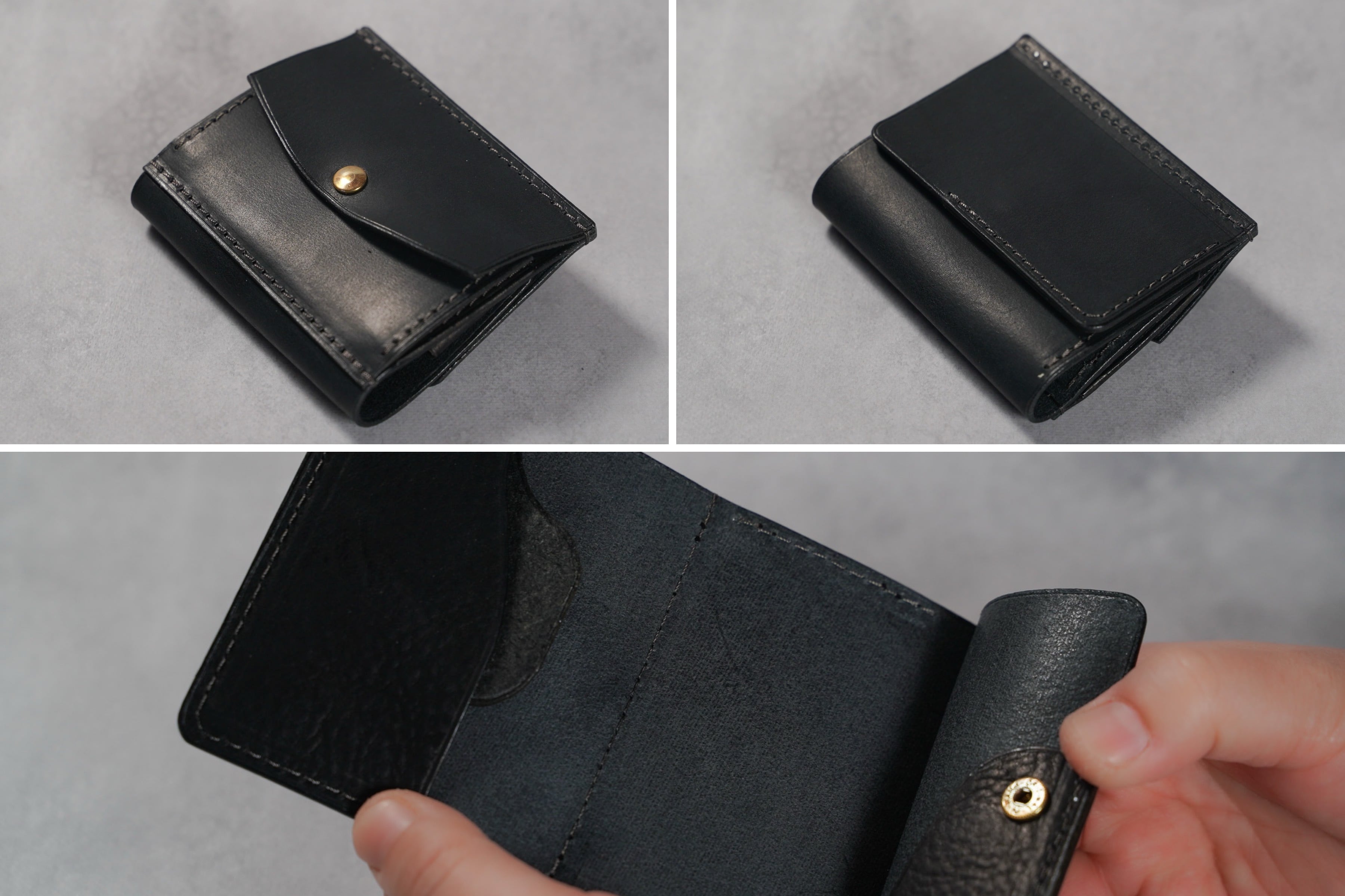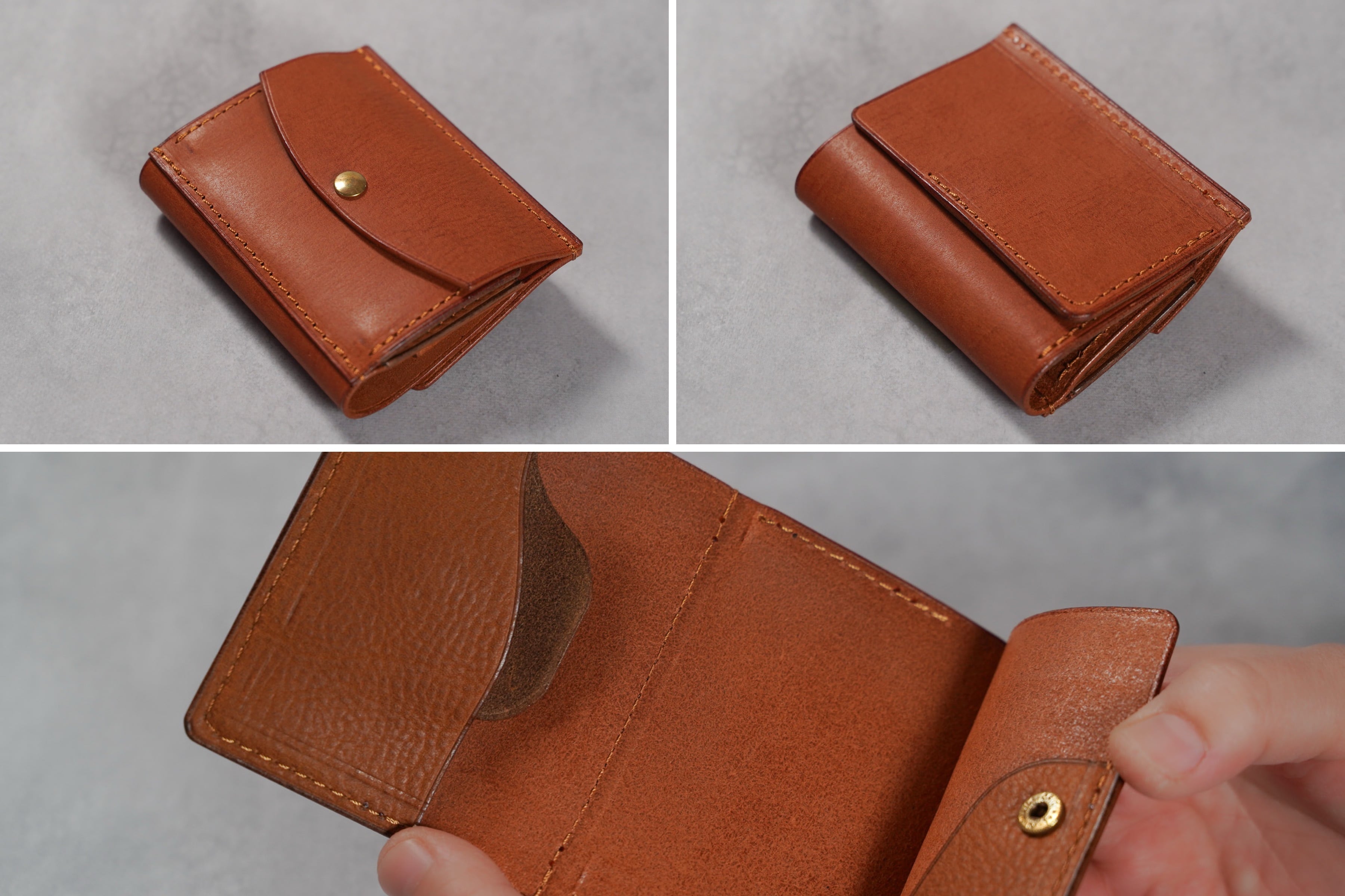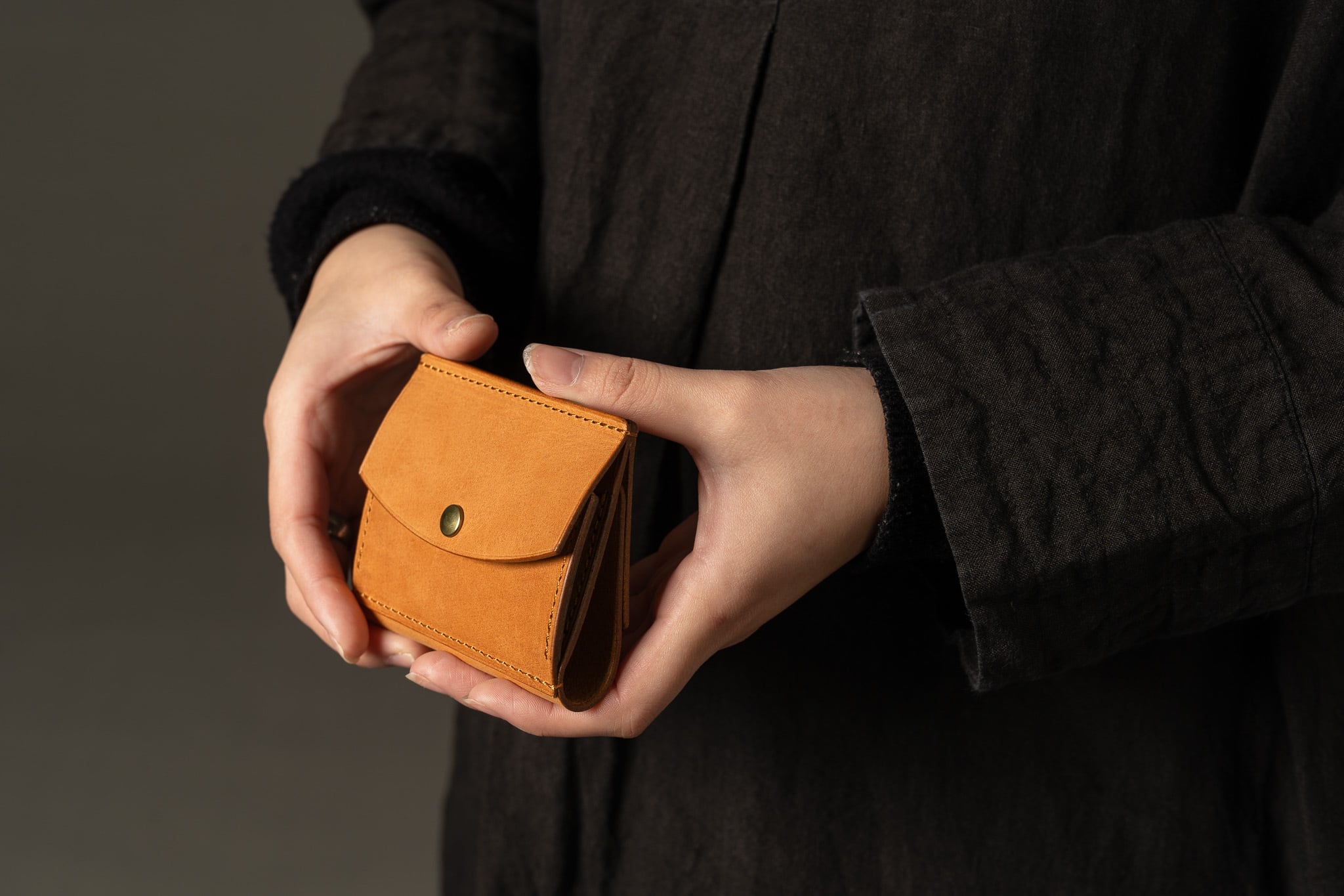 お札は約10枚、カードはプラスチック製の厚さのものを約5枚収納でき、小銭入れは浅めで見やすく、財布を畳んだ時は外側にあるので、見た目以上の容量です。