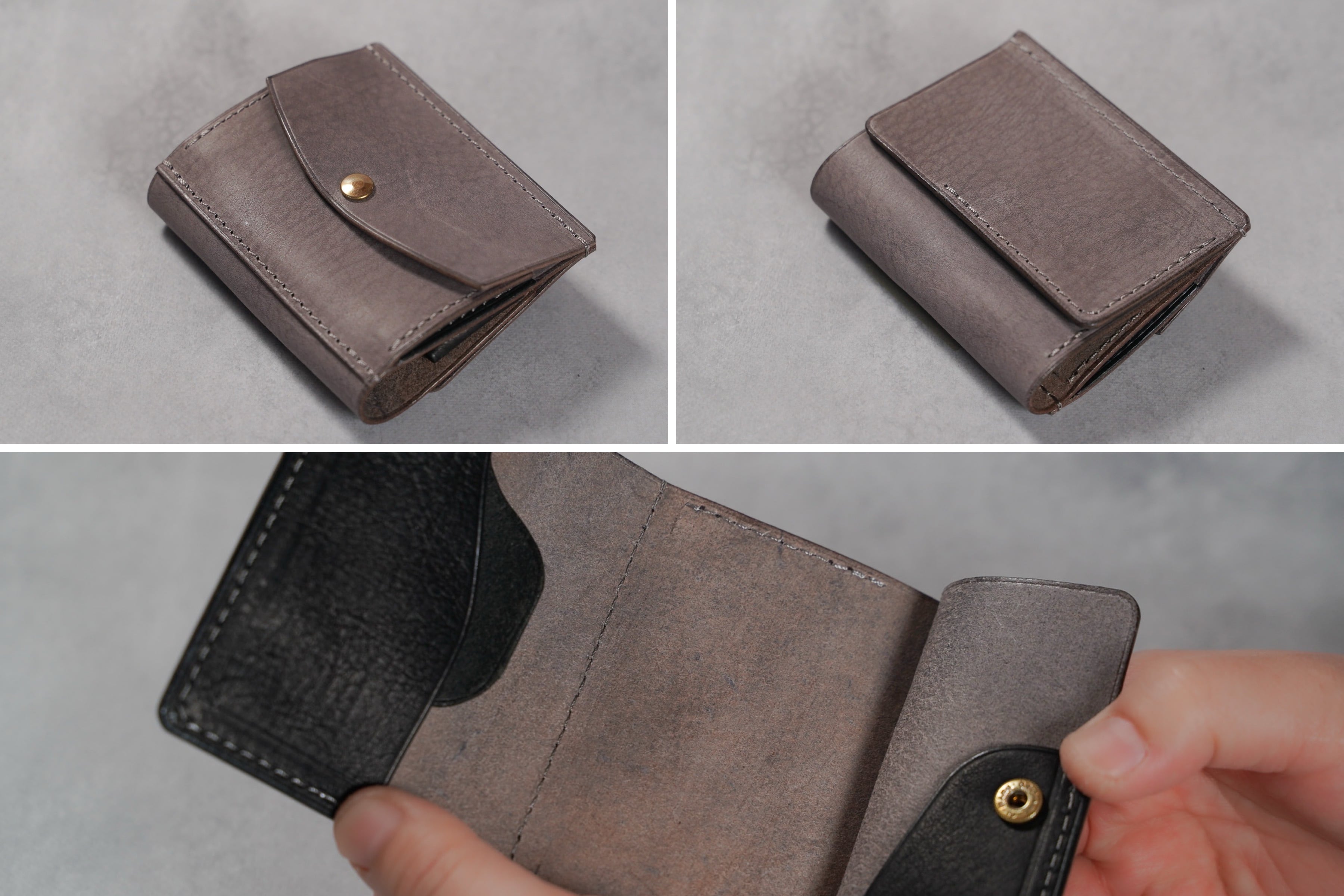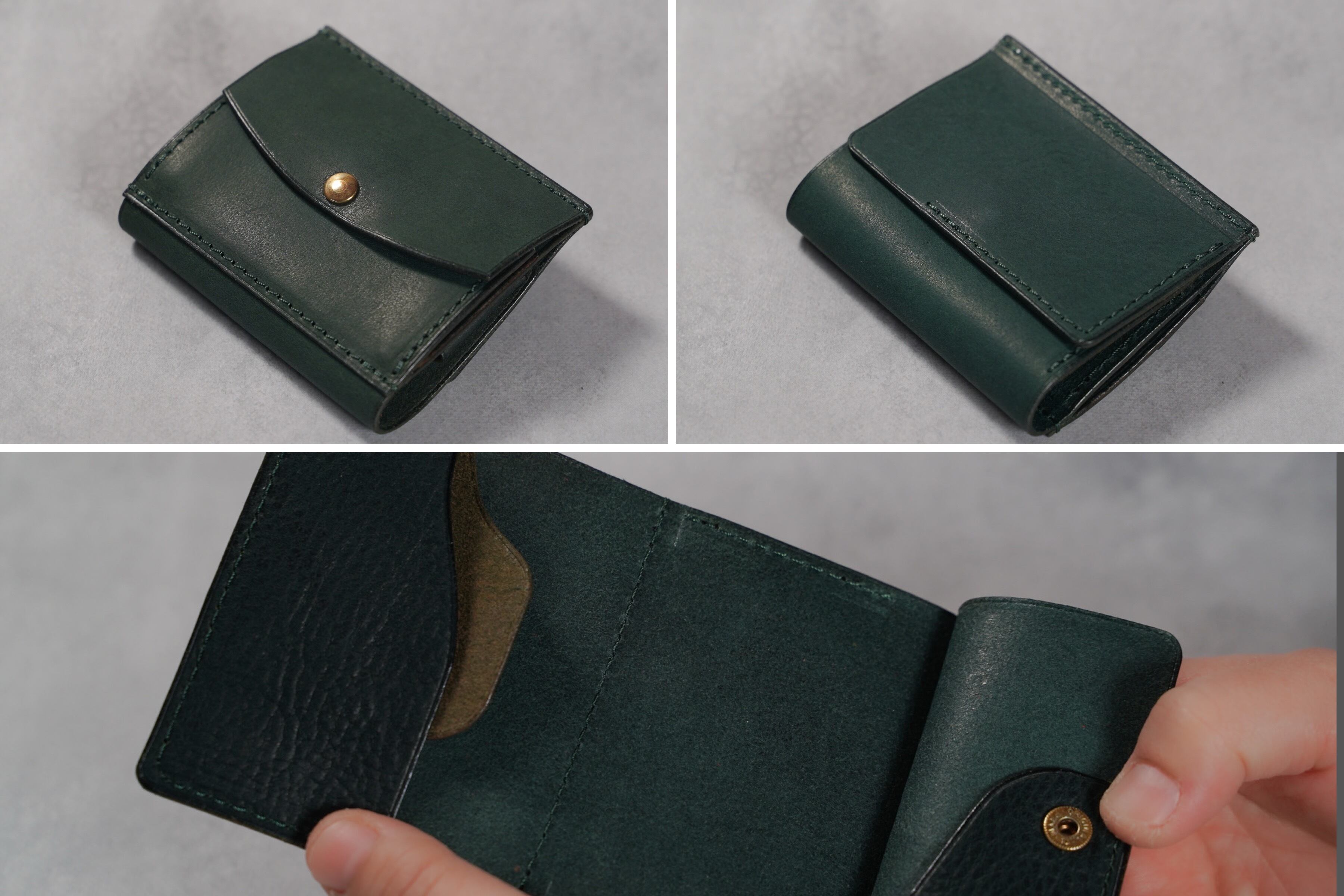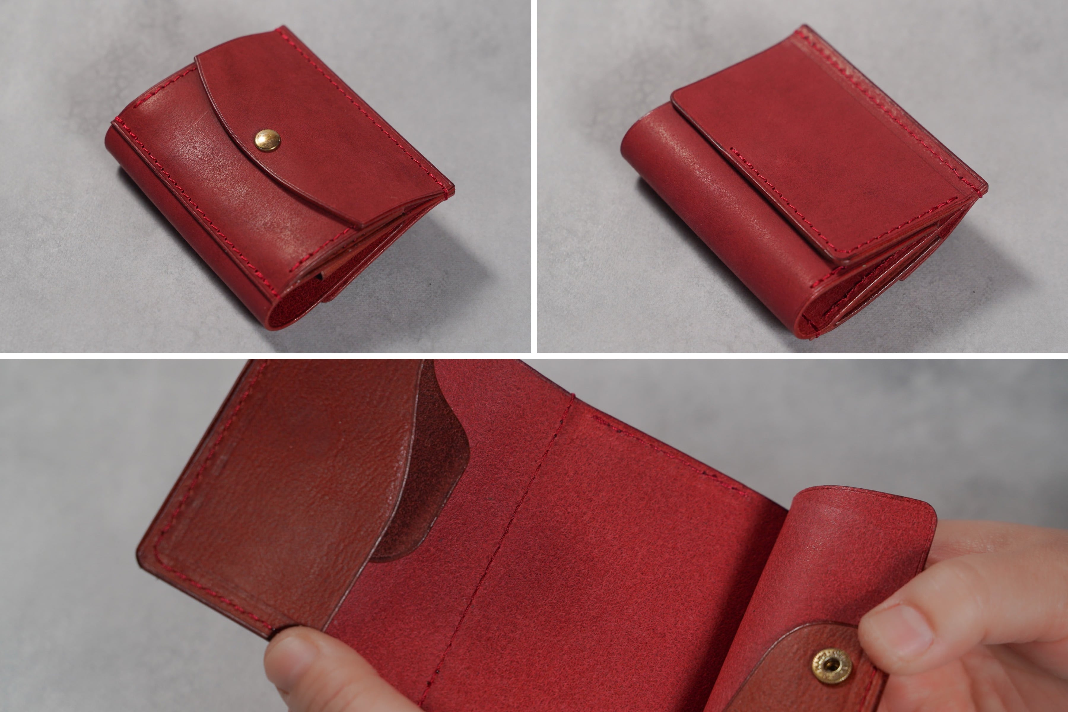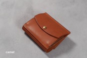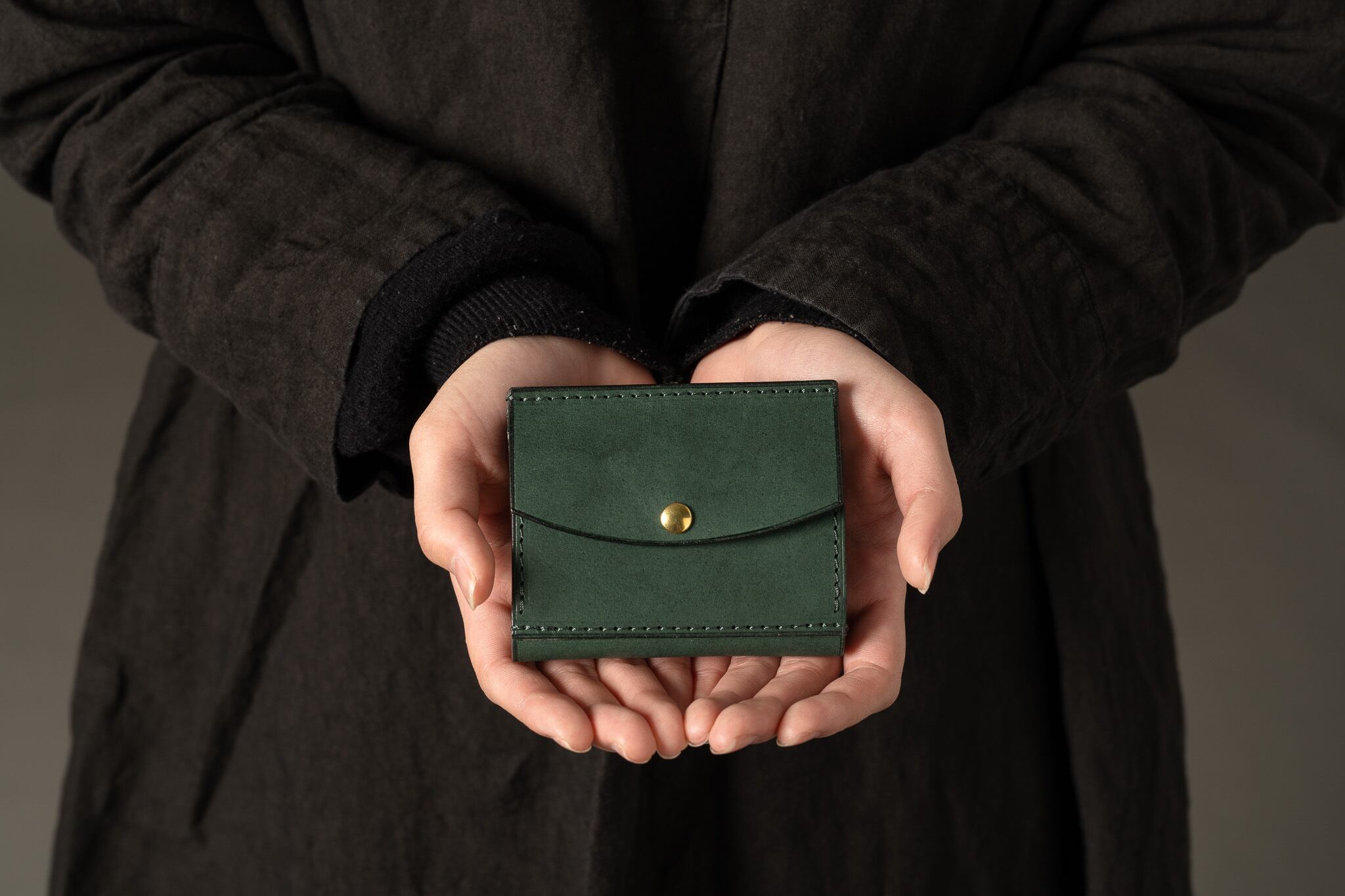 お札は約10枚、カードはプラスチック製の厚さのものを約5枚収納でき、小銭入れは浅めで見やすく、財布を畳んだ時は外側にあるので、見た目以上の容量です。
