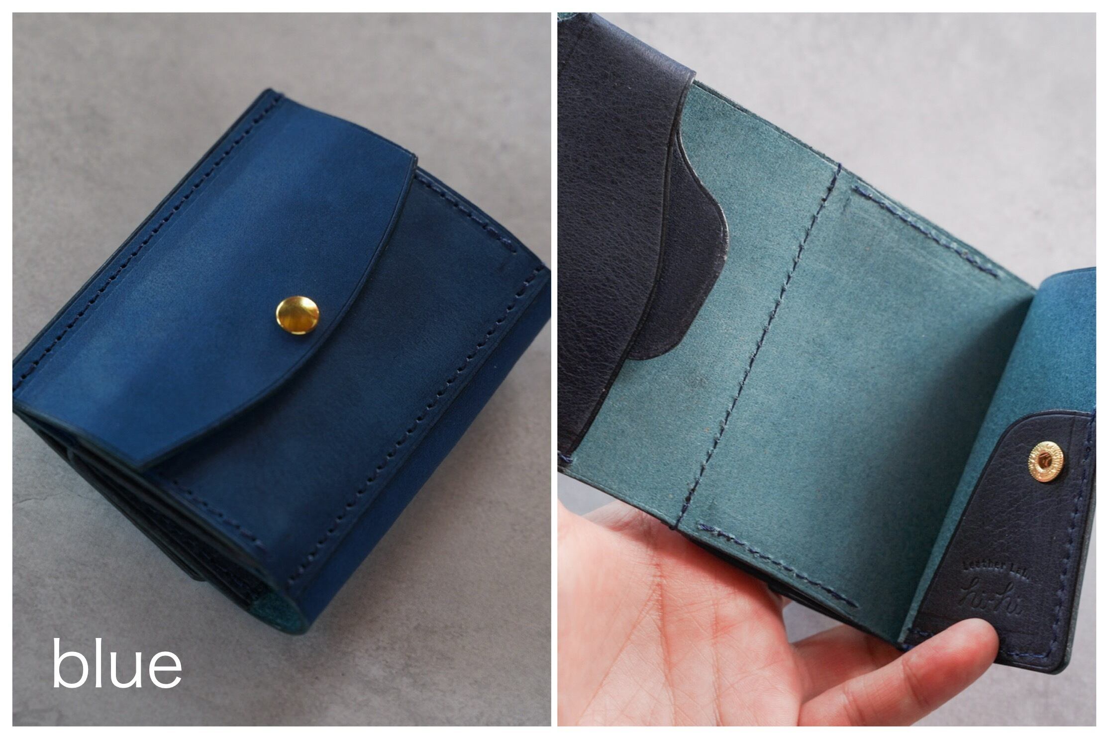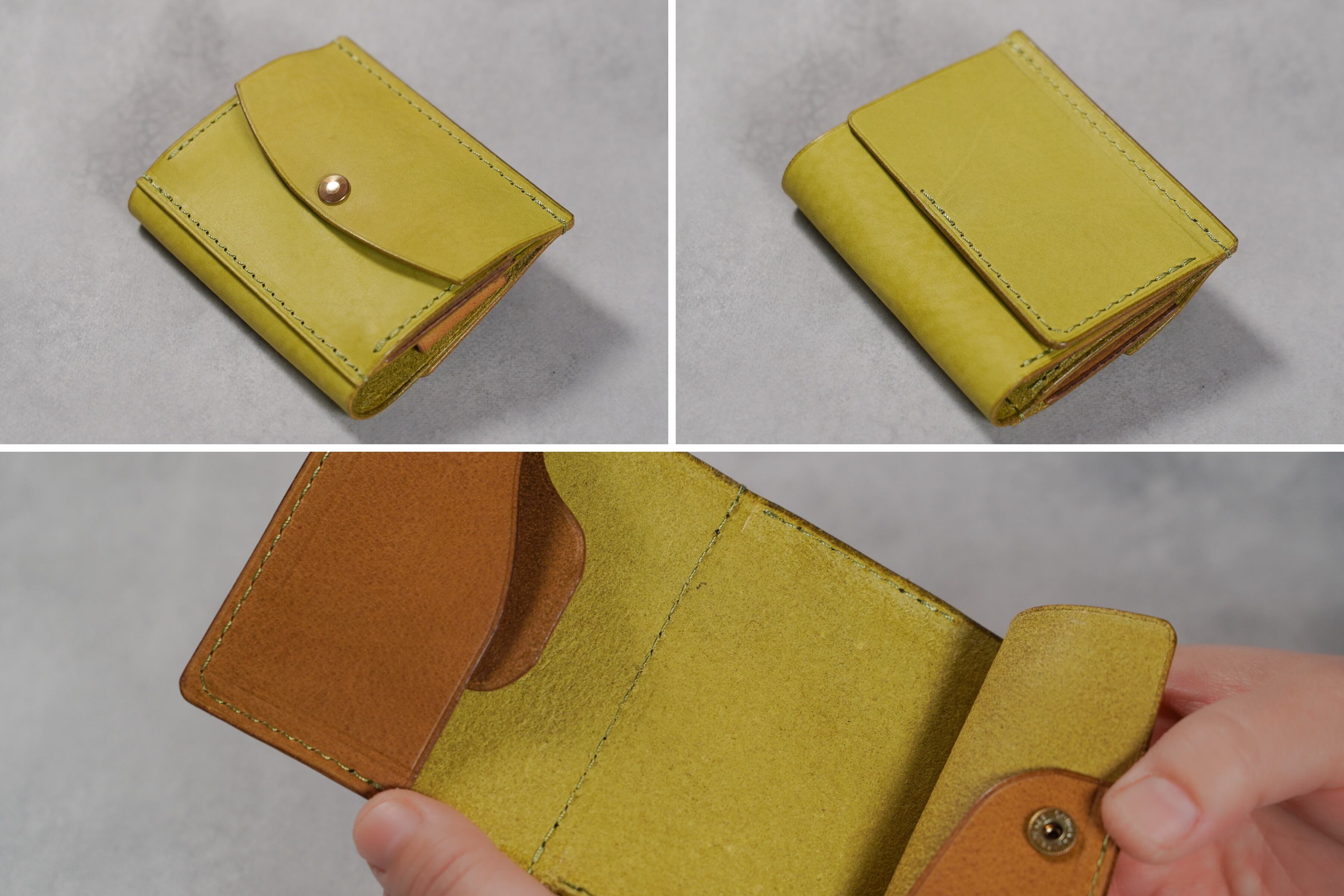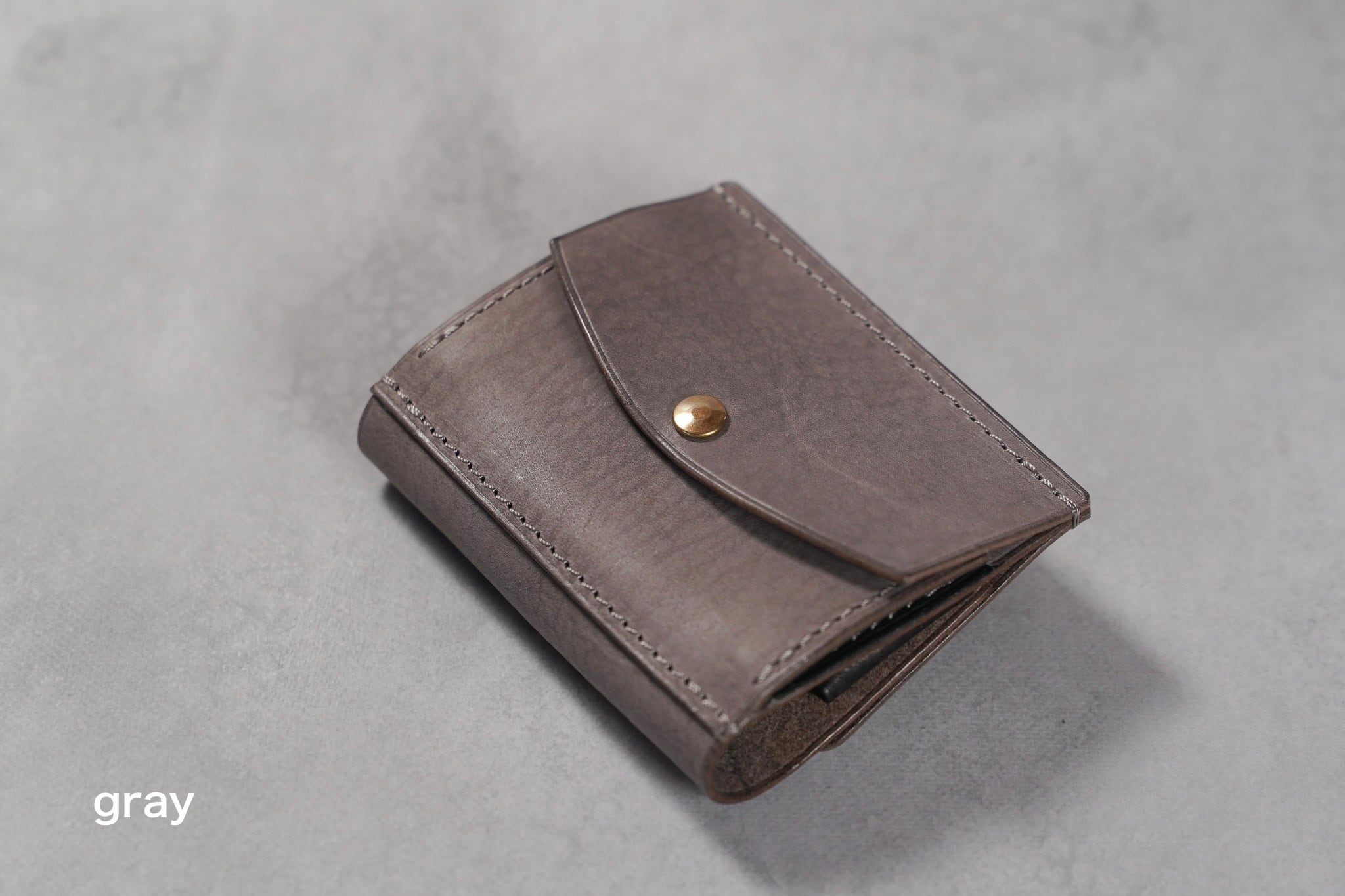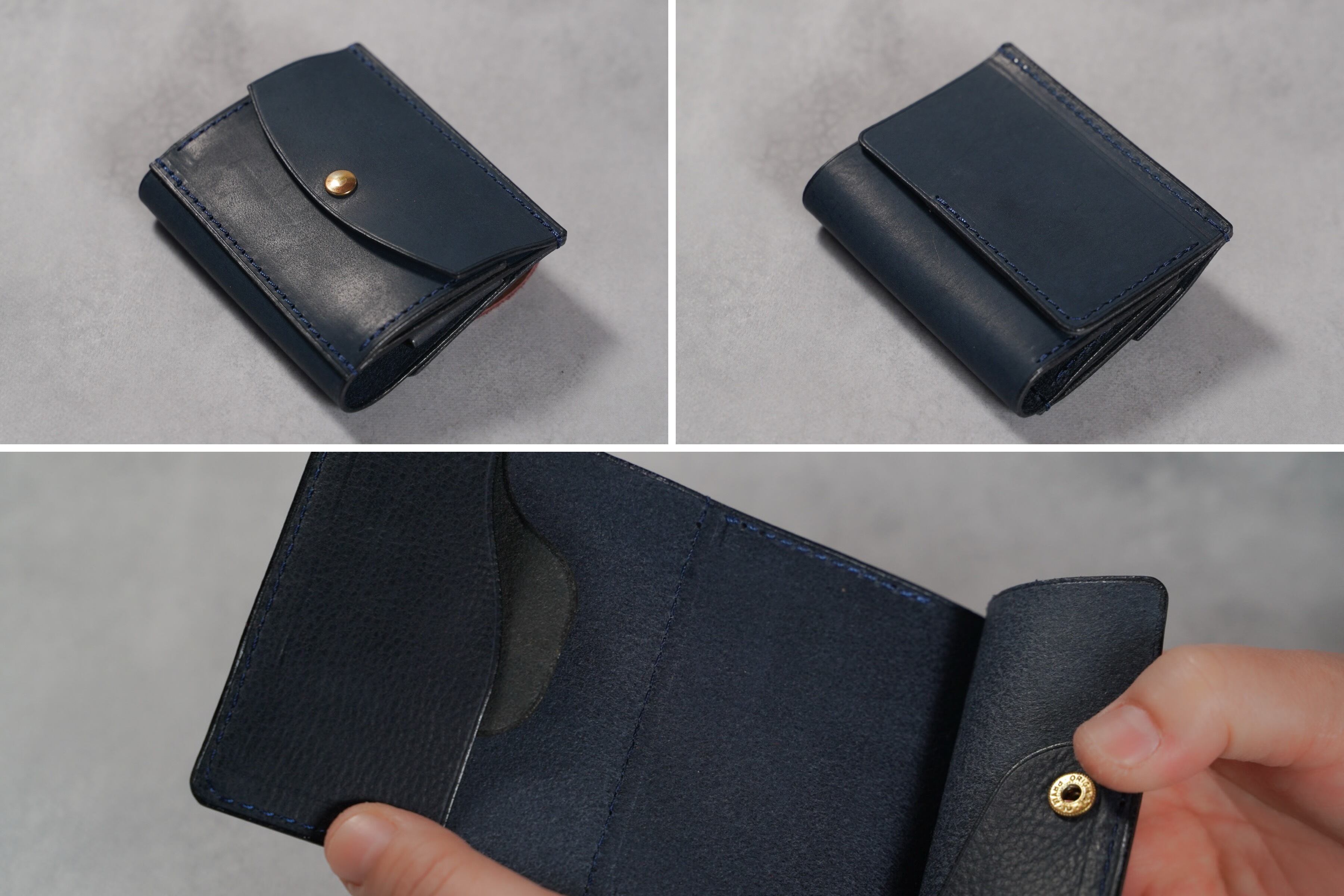 お札は約10枚、カードはプラスチック製の厚さのものを約5枚収納でき、小銭入れは浅めで見やすく、財布を畳んだ時は外側にあるので、見た目以上の容量です。