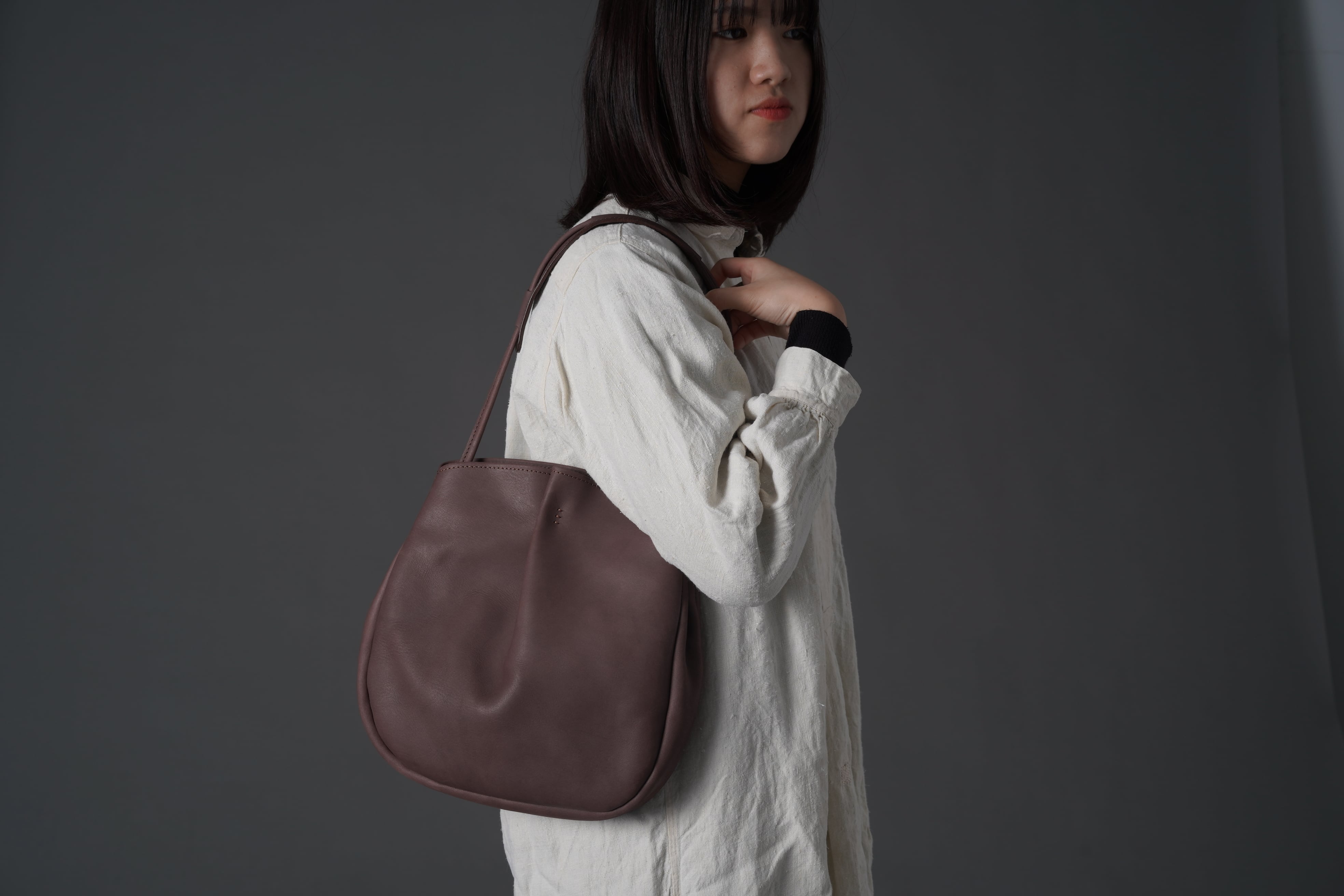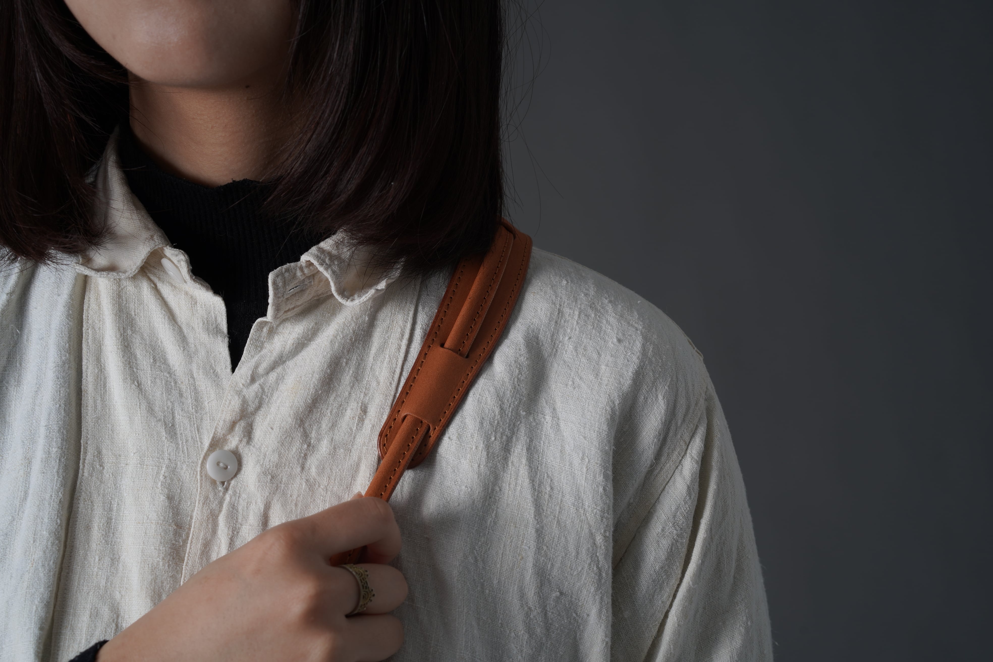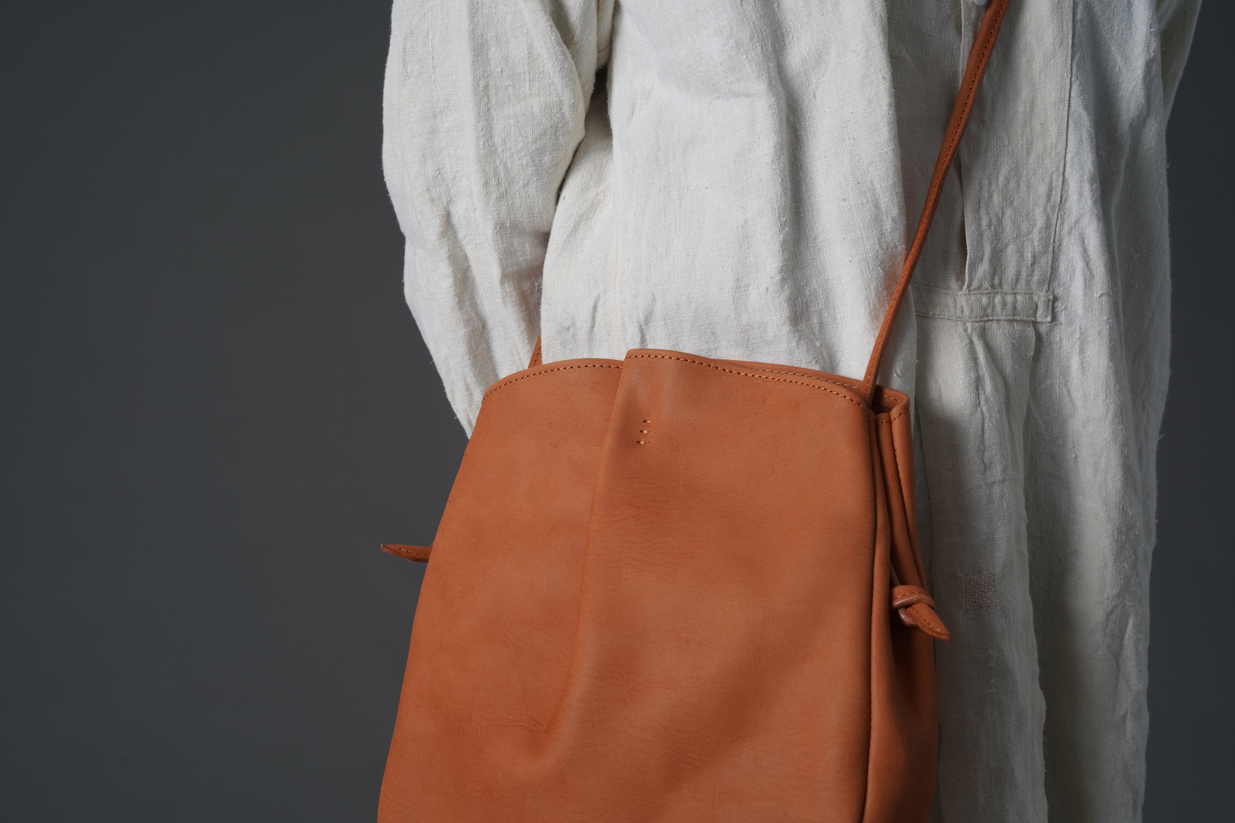 ストラップの結び目で使いやすい長さに変えれば、斜め掛けから短く肩掛けにもできます。