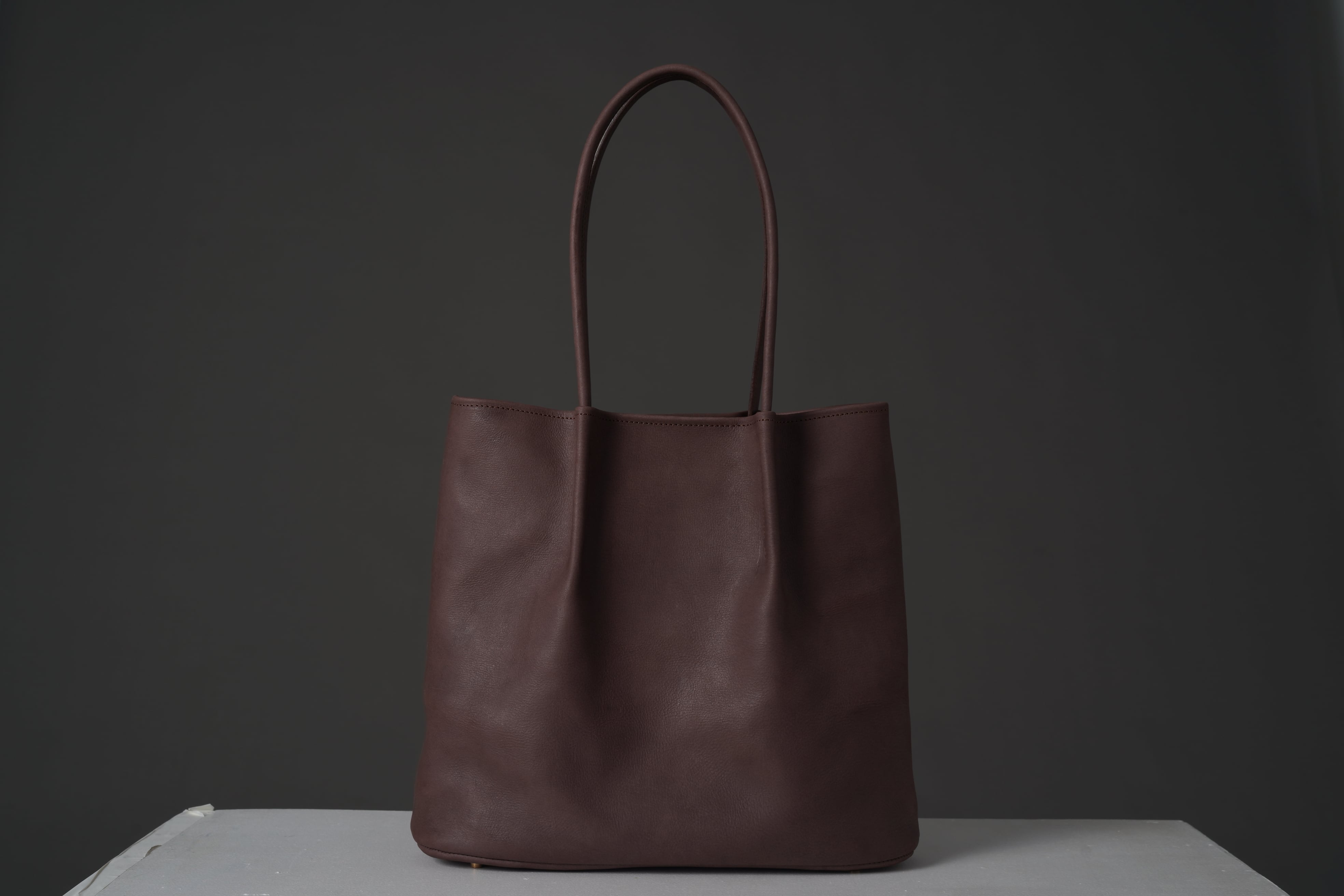 風に揺らぐカーテンの様子からイメージしたなめらかなフォルムは、上部が広がらずすっきりと見せてくれる台形型。底芯と底鋲が付いています。経年変化によりハンドルの付け根にアタリが生まれ表情の変化も楽しませてくれる鞄です。